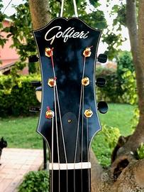 chitarra costruita nel 2018, ispirata al progetto di Benedetto; larghezza al lobo inferiore 17" (43 cm circa) tavola e fondo in legno massello scolpito a mano, tavola in abete val di fiemme fondo / fasce / manico in acero marezzato tastiera / cordiera / battipenna / copripaletta in ebano pickup sospeso Kent Armstrong con micro potenziometro volume montato nascosto addosso al battipenna, tutto sospeso rispetto alla tavola armonica ed eventualme il gruppo battipenna e pickup si possono smontare per utilizzo in modalità solo acustica. verniciatura e sunburst a base di vernici a spirito - finitura a gommalacca a tampone disponibile per qualsiasi prova - ritiro solo a mano. inclusa custodia rigida e tracolla in pelle fatta realizzare su mio disegno da un artigiano locale