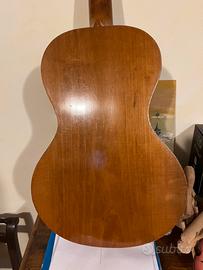 Chitarra parlor tedesca anni 50 top cedro canadese massello, fasce e fondo acero massello. Action confortevole. Ottima per il fingerpicking blues. Restaurata e in buono stato. Viene con custodia originale.
