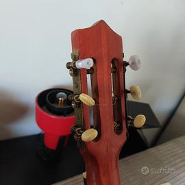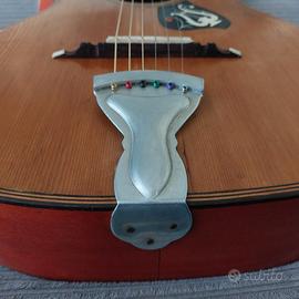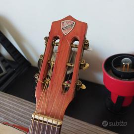Chitarra acustica vintage tipo parlor catanese. Piccola, carina e leggera, un pezzo di storia della liuteria siciliana. La chitarra è degli anni 60, di manifattura catanese, realizzata in Sicilia a marchio della famiglia di rivenditori musicali belgi Frambach, con sede a Liegi, boulevard d’Avroy 44-46, attivi fino al 1977. Decorazioni di gusto art deco, battipenna con lira intarsiata. Due meccaniche non originali, per il resto ottime condizioni funzionali. Settata, con corde nuove, pronta a suonare. Top in abete massello Fondo e fasce in mogano Scala 624 mm / 24.5 inches Larghezza capotasto 46 mm Lunghezza totale 960 mm Lunghezza corpo 480 mm Larghezza parte superiore 265 mm Larghezza vita 215 mm Larghezza parte inferiore 355 mm Peso 1.28 kg