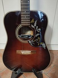 Vendo bellissima chitarra acustica Ibanez PF20 TV. La chitarra è completa di pick -up per collegamento ad amplificatore, pomello per attacco tracolla,battipenna decorativo.Finitura in legno di acero fiammato e tastiera in palissandro,meccaniche integre in metallo,ponte in palissandro.Come nuova