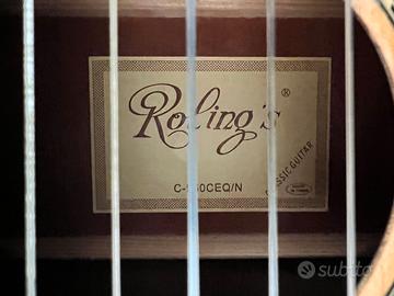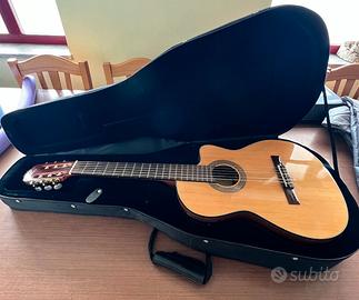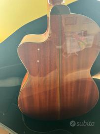 colore naturale, yop in cedro massello, fasce e fondo in mogano, tastiera e ponticello in palissandro, spalla mancante, preamplificata con EQ attivo a 3 bande Shadow, meccaniche dorate, finitura lucida.