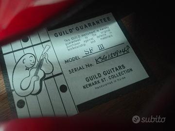 Chitarra Semiacustica Guild SF III + Pickup '60 + Custodia originale Chitarra perfetta, senza segni di usura. Risettata, monta pickup anni '60 (pickup originali compresi) Chitarra utilizzata precedentemente dal chitarrista Poggipollini. Specifiche: Forma del corpo: thinline hollow archtop Corpo: mogano laminato Spessore del corpo: 49 mm Manico monopezzo: mogano Tastiera: palissandro Lunghezza della scala: 628 mm Larghezza del capotasto: 42 mm 20 tasti Pick-up: 2 humbucker Guild Anti-Hum Dual-Coil (smontate) Pick-up anni 60' (montati) Ponte Guild Adjusto-Matic Tremolo: Bigsby B60 Meccaniche: Grover Sta-Tite Colore: Cherry Red