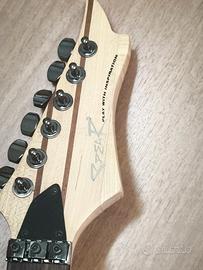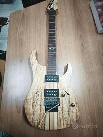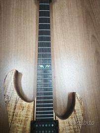 Chitarra Spear Gladius con finitura in acero spalted naturale, costruzione neck-through-body, 2 humbucker e sistema tremolo a doppio bloccaggio con licenza Floyd Rose. Materiale del corpo Mogano/Acero Tastiera Palissandro Lunghezza della scala 25,5" (647 mm)