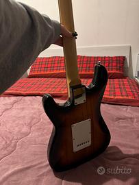 Chitarra = manico in acero, tastiera in palissandro, pick-up 3 single coil, selettore a 5 posizioni, 1 manopola del volume e 2 toni, ponte con leva del tremolo standard, colorazione Sunburst.