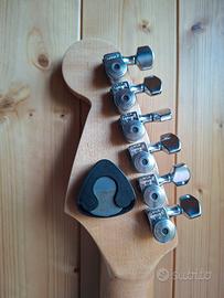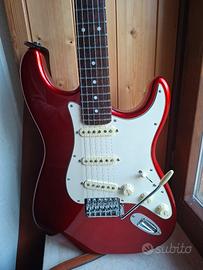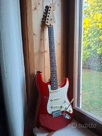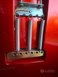 Chitarra modello Stratocaster costruita interamente da me: - Body red Alder stagionato 20 anni ,2 pezzi (misure Fender) - manico acero taglio di quarto , tastiera in palissandro, 22 tasti, fret dunlop, dot madreperla, radius 12", capotasto in osso - colore "candy apple red" (base grigio metallizzato + rosso translucent) tutto nitro (trasparente gloss finale nitro Sayerlack) - meccaniche autobloccanti sperzel - ponte 6 viti wilkinson con blocco inerziale in ottone - pickup single coil Xotic vintage raw RV-60 set (suono caldo e corposo tipico dei primi anni '60) - potenziometri da 250k "dunlop superpot" - condensatore carta olio da 0.022 ųf PIO (paper in oil) - selettore 5 vie CTS - connettore input Jack clear sound ( ha 4 alette anziché 2 , per una maggiore stabilità del Jack e maggior superficie di contatto - tracolla artigianale in pelle doppio strato di ottima fattura realizzata su mie specifiche , leggermente piu larga rispetto alle misure standard per avere piu confort - battipenna , manopole copri pickup e copri leva tremolo tutto rigorosamente originale Fender , colore "white parchment". Prezzo: 1500 euro tratt.