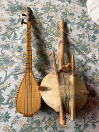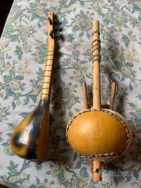 Due piccole chitarre etniche, una turca a sinistra in legno, e una fatta con una zucca svuotata e legno del Senegal, non sono fatte per suonare, sono semplici soprammobili ciascuna a 10 €