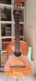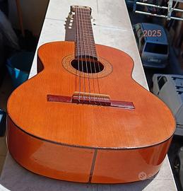 due chitarre spagnole costruite a mano a Valencia di valore storico,in Italia ce ne sono due pezzi per ognuna contando queste,entrambe hanno ricevuto dei trattamenti conservativi ed estetici accurati e appassionati e sono presentabili fanno bella figura esposte CHITARRA 1 Miguel Angel anni 60,classica flamenca, si ritiene costruita dal liutaio di Valencia Vicente Sanchis Carpio, fondo e fasce di cipresso, tavola di cedro,aspetto molto particolare dato dalla colorazione tutta arancione,manico molto confortevole si arpeggia benissimo,suono tipico delle chitarre flamenco,ottimo stato si scorda pochissimo e può essere suonata a piacimento. CHITARRA 2 Roca Navarro anni 50,classica parlor,aspetto particolare dato dalla sua forma che le permette di stare in equilibrio su se stessa, suono brillante classico e sorprendentemente forte,manico stretto consente arpeggi veloci,buone condizioni, questa e'proprio un pezzo di antiquariato suona senza problemi ma tende a scordarsi leggermente,ottima per esposizione ma si suona con attenzione e senza stressarla.Ha bisogno di corde nuove. PREZZI 230 cadauna altre foto a richiesta tel 3663753675