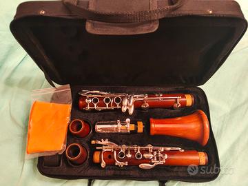 Clarinetto in palissandro nuovo. Doppio barilotto. Chiavi argentate e custodia. Cinghia per trasporto.