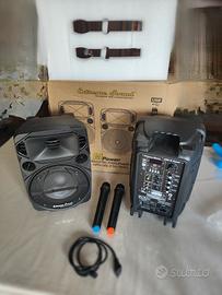 Vendo per inutilizzo, completo di 2 microfoni in frequenza diretta sulle casse con master volume dedicato (MIC. VOL), USB, BLUETOOTH, TF CARD, RADIO FM.