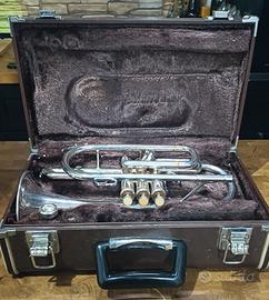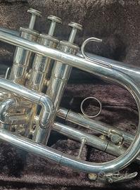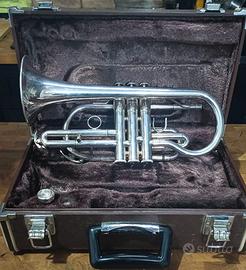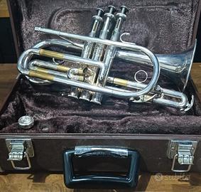 Cornetta Yamaha 3335s, modello intermedio di produzione giapponese, anni '80, in perfetto stato di conservazione, eccetto un ding di minuscola entità che io stesso ho provveduto a far riparare e controllare da un professionista. L'argentatura è praticamente al 100%. Completa di bocchino e custodia originale Yamaha.