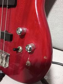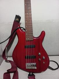 Basso Cort Actiov V Plus TR a 5 corde usato, ha qualche piccolo danno estetico (come in foto) ed è stato modificato - rimossa la capacità passiva e al posto del mix pickup è stato inserito uno switch. Tutto funzionante. Il basso, diversamente da foto, viene con gli attacchi da tracolla normali di serie.