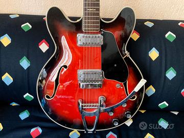 Chitarra prodotta in Italia tra la fine degli anni '70 ed i primi anni '80 (mi è difficile risalire all'anno preciso di fabbricazione ma è di proprietà della mia famiglia dal 1982). Molto ben rifinita, riproduce l'estetica della Gibson 335. Il ponte-leva del vibrato è in stile Bigsby. Ben tenuta, non presenta difetti. Purtroppo nel tempo ho perso la placca della marca che era originariamente sulla paletta ed un copri meccanica posteriore sulla chiavetta per accordare (come da ultima foto).