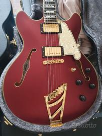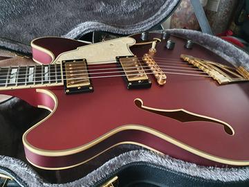 Corpo in acero semi-hollow con doppia filettatura e doppia buca a F. Cordiera a trapezio Art Déco con ponte Tune-O-Matic. Battipenna Perlato e hardware dorato. La chitarra pesa 3,74 kg.