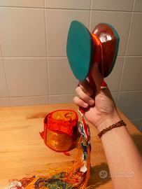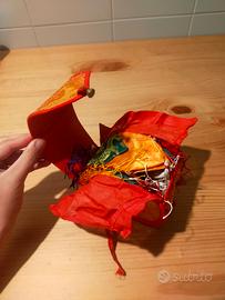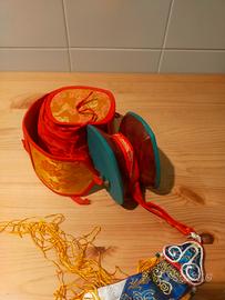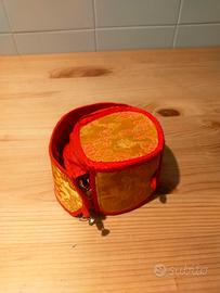 Damaru, tamburo rituale di origine nepalese. Legno e stoffa decorata, custodia richiudibile. Diametro di circa 10 cm