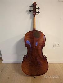 Violoncello ideale per principianti, tavola in abete laminato, fondo e fasce in tiglio, tastiera e piroli ebanizzati. Finitura marrone-arancio, suono caldo e uniforme. Dotato di cordiera con 4 accordatori di precisione.