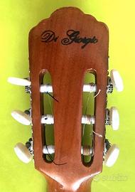 Chitarra Di giorgio Classico 28 1989. Made in Brasil . Ponte e tavola armonica planari e senza incurvature . Action 12° tasto 4 e 5 mm . Meccaniche fluide. Corde Augustine Imperial Black Low tension nuove e placchette Rosette made in Usa. Suono potente e presente: timbro profondo sui bassi e aperto su cantini