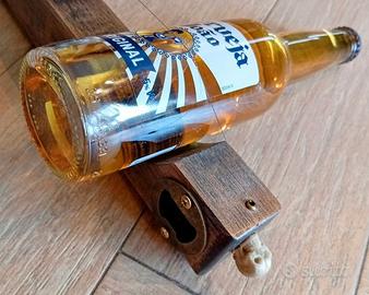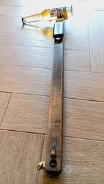 Diddley bow artigianale realizzato con legno di mogano, bottiglia di birra, apribottiglie e teschio vari. Strumento unico al mondo.
