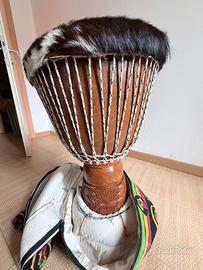 Vendo djembè artigianale di origine africana. Strumento in legno massello scavato e pelle naturale, completo di corde originali. Suono potente e ben definito. Inclusa custodia imbottita con tracolla.