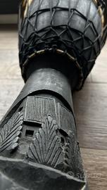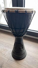Djembe africano artigianale in legno massello nero, con decorazione intagliata a mano raffigurante un elefante sulla base. Pelle naturale tesa con sistema di corde tradizionali. Suono pieno e caldo. Altezza circa 50-60 cm. Perfetto come strumento musicale o come elemento d'arredo etnico di carattere. Ritiro a Formello (RM).