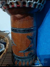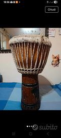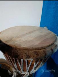 Questo oggetto è un djembe, un tradizionale tamburo africano a calice originario dell'Africa occidentale. È composto da un corpo in legno scavato e una membrana in pelle di capra o mucca, tesa tramite un sistema di corde e cerchi metallici. Viene suonato con le mani nude, producendo tre suoni principali: basso, tono (medio) e slap (acuto).