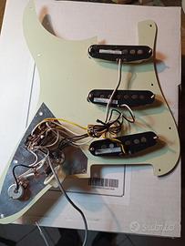 elettronica completa smontata da una Squier Classic Vibe e appoggiata per questioni fotografiche su mascherina Schecter, che includo tanto non mi serve. la mascherina ha solo due pot ma l' elettronica li ha tutti e tre, come si vede dalla seconda immagine. Mai usata, sostituita subito con quella Schecter.