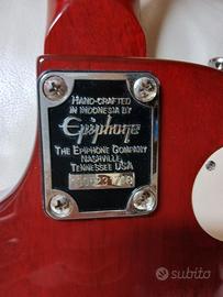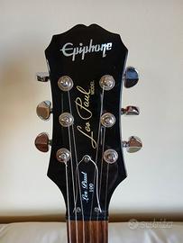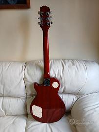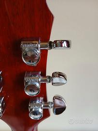 Vendo chitarra elettrica solid-body EPIPHONE LES PAUL 100 HERITAGE CHERRY SUNBURST (HS) CUSTOM. Realizzata in Indonesia. Strumento eccellente, realizzato secondo le stesse specifiche e caratteristiche della Les Paul del 1952, compreso il tipico timbro sonoro caldo, potente e avvolgente. Selettore a 3 vie Toggle Rhythm/Treble. Monta 2 pick-up DiMarzio, e precisamente un PAF JOE (Satriani) al ponte e un AIR ZONE al manico (dal valore di circa 120 euro l’uno), con controlli di volume separati con manopole di controllo Gold Speed Knobs. Installate dal liutaio anche due levette di controllo per splittare a single coil entrambi i pick-up (al posto dei controlli tono). Hardware: Cromato; larghezza al capotasto: 42,67 mm; raggio della tastiera: 304,80 mm, lunghezza della scala: 628,65 mm; cordiera: Stopbar e ponte LockTone Tune-O-Matic, come i modelli di fascia superiore; battipenna, switchwasher, interruttore e mounting rings color crema; manico in Mogano avvitato con profilo C molto maneggevole; tastiera a 22 tasti medium jumbo in Palissandro, con intarsi Dot; unico corpo in Mogano con forma Les Paul, leggermente più sottile per offrire il massimo comfort; top in Acero con finitura lucida Heritage Cherry Sunburst (HS). Meccaniche GROVER Rotomatic. Set-up con regolazione action e ottave da liutaio. Condizioni eccellenti e pronta all'uso.
