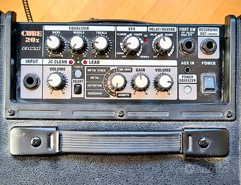 - Amplificatore Roland Cube20x 20W con effettistica di base integrata e power-squeezer per ridurre il volume in uscita, utile in ambiente domestico.