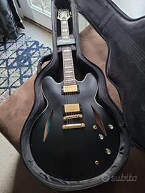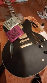 Ritiro a mano. Prova disponibile. Legni e Costruzione Corpo: Acero multistrato (layered maple) con blocco centrale in acero massiccio per ridurre il feedback. Buche: Design personalizzato a diamante (Diamond hole) invece delle classiche a "f". Manico: Mogano incollato (set-neck) con profilo '60s SlimTaper C per una suonabilità veloce. Tastiera: Alloro indiano (Indian Laurel) con raggio di 12" e 22 tasti Medium Jumbo. Intarsi: Blocchi in madreperla con fulmini in abalone (Lightning Bolt). Elettronica e Hardware Pickup: Due humbucker Epiphone Alnico Classic PRO. Controlli: 2 volumi, 1 tono master con potenziometri CTS di alta qualità e selettore a 3 vie. Ponte: Epiphone LockTone Tune-O-Matic con cordiera Stop Bar. Meccaniche: Grover Rotomatic dorate invecchiate. Capotasto: Graph Tech con larghezza di 43 mm. Dettagli Estetici e Accessori Paletta: Forma "Kalamazoo" anni '60 con logo "Tree of Life" sul fronte e firma "Stealth" di Emily Wolfe sul retro. Case incluso: Viene fornita con una custodia semi-rigida EpiLite. Finitura: Black Aged Gloss (nero lucido invecchiato/opaco) con hardware Gold (Lightly Aged). Questa chitarra è particolarmente apprezzata per il suo sustain elevato e la versatilità tonale, adatta sia al rock classico che a generi più moderni