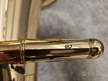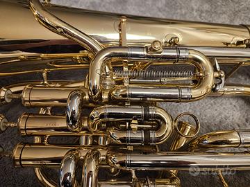 Vendo, per inutilizzo, Euphonium Antoine Courtois mod. 167 - compensato, laccatura dorata, dotato di trigger sul primo pistone. Pompe e pistoni funzionanti. Presenta la normale usura del tempo (utilizzato per circa 15 anni). Alcune piccole ammaccature qua e la.