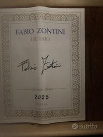 La chitarra è stata realizzata dal liutaio Fabio Zontini, noto per la cura artigianale e l’eccellente equilibrio timbrico dei suoi strumenti. Lo strumento si presenta in ottime condizioni strutturali e acustiche. È presente un piccolo segno sulla tavola armonica, causato da un lieve incidente avvenuto durante una lezione: si tratta esclusivamente di un difetto estetico, che non compromette in alcun modo la qualità del suono o la risposta dello strumento. Il timbro rimane ricco, profondo e proiettato, perfettamente in linea con lo standard degli strumenti di Zontini