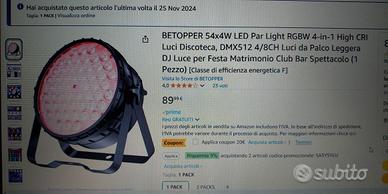 Per inutilizzo vendo faro da palco nuovo ricevuto in regalo da Amazon questa settimana al prezzo di 90 euro come visibile in foto. Si tratta di un faro professionale da utilizzare per concerti all'aperto montato su traliccio, oppure palcoscenico di teatro. Non adatto a utilizzo domestico in piccole stanze perche è veramente potente e accecante. Magari per grandi sale di locali potrebbe anche risultare adeguato. Il faro come si vede dalle ultime foto in cui lo tengo in mano per dare un'idea delle dimensioni, è abbastanza massiccio sia a livello di dimensioni che di peso...ha una ventola di ventilazione sul retro che lavora autonomamente, i led sono di potenza 54x4 watt. Il meglio di se lo da chiaramente collegato ad una consolle luci, ma può anche essere utilizzato senza cioe singolarmente con i controlli situati sul pannello posteriore che comunque torno a ripetere lo limitano un pò. Cedo alla metà del prezzo perche è troppo forte e non ci serve... Nuovo con scatola originale, mai usato. Vendo per inutilizzo e immediato realizzo quindi prezzo non trattabile e restituzione non accettata dopo l'acquisto. Grazie