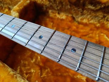 Questa Stratocaster si distingue per la sua comoda tasca, l'hardware dorato, la speciale piastra posteriore del 50° anniversario e gli intarsi a puntini di Abalone. Pesa comodamente 3,5 chilogrammi e ha appena avuto una nuova configurazione con corde calibro .10.