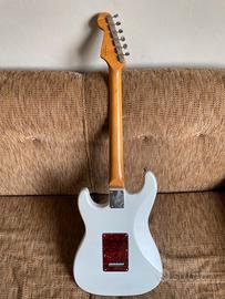 Vendo Fender Classic Series '60s Stratocaster, originariamente colore Lake Placid Blue. Il corpo è stato sostituito dal precedente proprietario con uno multistrato, e il ponte è bloccato.
