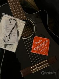 Usata pochissimo, come nuova. PREFERIBILMENTE ZONA ROMA CON CONSEGNA A MANO. NON SCAMBIO. I modelli CN Classic Design combinano una facile suonabilità e il suono tipico delle corde in nylon con il comfort della spaziatura delle corde in acciaio. Fender ha sostituito i tipici manici larghi normalmente presenti sulle chitarre classiche con lo stesso profilo del manico facile da suonare che si trova su tutti gli altri modelli Classic Design. Come richiamo alla tradizione, la CN-140SCE utilizza un top in cedro massello, assieme a fondo e fasce in palissandro per un suono caldo e morbido. La CN-140SCE offre un'esperienza estremamente confortevole per i chitarristi di qualsiasi livello: il body da concerto "sottile" la rende una chitarra perfetta per il salotto e per il palco, mentre il cutaway singolo facilita l'accesso ai tasti più alti. Quando si presenta la necessità di collegarla, l'elettronica Fishman di questo modello fornisce un controllo tonale semplice ma potente. Caratteristiche Formato del body: Concert Thinline Top: Cedro massello Fondo e fasce: Palissandro laminato Bracing: Fan classico Manico: Mogano Profilo del manico: "Easy to Play" Raggio: 12" Tastiera: Noce Tasti: 18, stile vintage Scala: 642m (25,3") Meccaniche: 3-inline con manopole ambra Ponte: Palissandro Capotasto e sella: NuBone Capotato: 42,93mm (1.690") Elettronica: Fishman CD Preamp Colore: Nero Finitura: Lucida Custodia inclusa: Custodia rigida