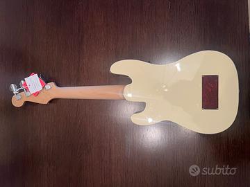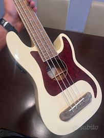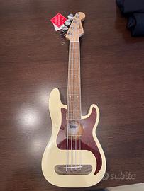 Fender Fullerton Precision Bass Uke, tastiera in noce, battipenna tartarugato, bianco olimpico. Mai utilizzato, ancora nel suo imballaggio. Ottimo per principianti, facilmente manovrabile con lunghezza della scala di 51 cm. Ricambio corde molto più semplice rispetto ai classici ukulele grazie al ponte senza nodi. Dotato di sintetizzatore integrato con controllo volume e tono molto intuitivo. Leggerezza sorprendente e proporzioni compatte.