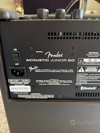Vendo questa splendido FENDER Acoustic JR Go causa inutilizzo. AMPLIFICATORE COMBO A 2 CANALI PER CHITARRA ACUSTICA CON BATTERIA RICARICABILE 100W 2 ingressi combo XLR / TRS per microfono e chitarra acustica. Effetti integrati, connessione Bluetooth. II Fender Acoustic Junior Go può suonare ovunque tu voglia. Ogni canale dispone di un equalizzatore a 3 bande, otto effetti selezionabili, volume dell'effetto, switch di fase e controllo del volume principale. La batteria ricaricabile integrata offre 5 ore di riproduzione a pieno volume e fino a 12 ore a volume moderato Il woofer da 8" ed il tweeter a compressione producono un suono eccezionale. Possibilità di vedere & provare prima dell'acquisto se residenti a Milano. 2 ingressi combo XLR / TRS per microfono e chitarra acustica. Effetti integrati, connessione Bluetooth.