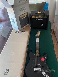 Vendo Fender Squier Sonic Stratocaster HSS colore Black insieme ad amplificatore Marshall MG15 Gold, set completo ideale per chi vuole iniziare a suonare la chitarra elettrica o per chi cerca uno strumento affidabile per lo studio domestico.