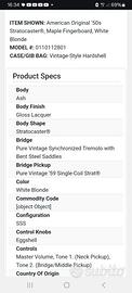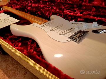 Cedo bellissima Stratocaster vintage, originale con accessori, nessuna modifica, body in frassino leggero con finitura in nitrocellulosa white blonde e venature del legno visibili, radius 9,5, pickup Pure Vintage '59, ottime condizioni. N.B. nelle foto il colore sembra diverso ma dal vivo è come da ultima foro. Disponibile a qualsiasi prova in zona; spedizione a carico del destinatario.