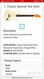 Vendo stratocaster made in japan del 2016 , la chitarra in questione è modello 60’s con tastiera in palissandro prodotta solo per il mercato interno giapponese.