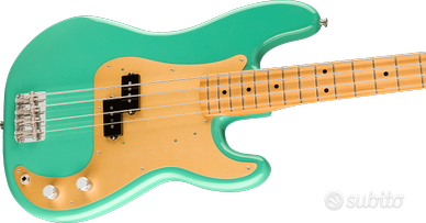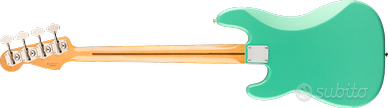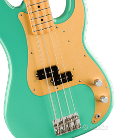 Body: Ontano Finitura: Poliestere lucido Pick-up: Vintage-Style '50s Split Precision Bass single-coil Controlli: Volume, Tone Ponte: 4-Sellette American Vintage Bass Hardware: Nichel / Cromo Meccaniche: American Vintage Reverse Open-Gear Bass Battipenna: Alluminio anodizzato dorato ad 1 strato Manopole: Flat-Top zigrinate Piastra: 4-Bolt Manico: Acero Finitura: Uretano lucido Profilo: Vintage "C" Scala: 34" (864mm) Tastiera: Acero Raggio: 7,25" (184,1mm) Tasti: 20, Vintage Capotasto: Osso sintetico Larghezza: 1,75" (44,45mm) Intarsi: Dot neri Truss Rod: Vintage-Style Colore: Sea Foam Green Made in Mexico N.B. Deluxe Gig Bag inclusa