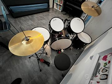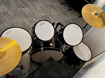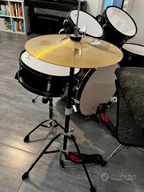Completa di hardware con aste doppio braccetto, seggiolino, piatti charleston 14", piatto crash 16"