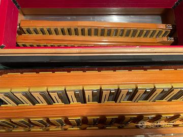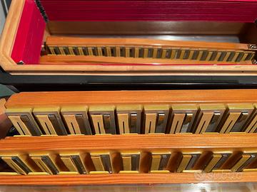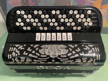 Fisarmonica a bottoni Dega (Morbidoni), 3/5, 120 bassi, 7 registri al canto, 5 registri ai bassi, esterno quasi pari al nuovo, voci in ottimo stato di conservazione, mantice a perfetta tenuta, cinghie, cuscino e strappini chiudi mantice in buono stato, compresa di custodia, disponibile alla prova a Trieste. Possibile la spedizione, di gran lunga preferibile la prova dello strumento e il ritiro a mano.