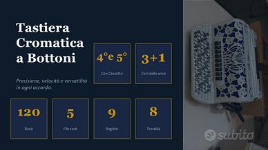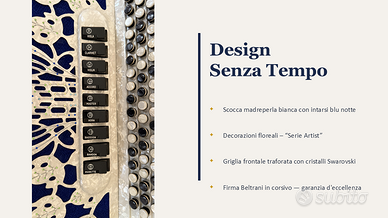L’Eccellenza dell’Artigianato Stradellino: Beltrami Serie Artist, il top della produzione Beltrami dedicata ai concertisti con voci fatte a mano! Se stai leggendo questo annuncio, conosci già il valore del marchio Beltrami. Metto in vendita, con un pizzico di rammarico per mancato utilizzo, un gioiello assoluto dell'artigianato di Stradella: una fisarmonica cromatica serie Artist, configurata con Doppio Cassotto in 4ª e 5ª (3+1). Si tratta di uno strumento di qualità eccelsa, destinato a professionisti o amatori esigenti che cercano una timbrica calda, una meccanica impeccabile e un'estetica che non passa inosservata. • Configurazione Voci: 4ª e 5ª con configurazione 3+1. • Doppio Cassotto: L'anima profonda di questa fisarmonica. Il cassotto regala suoni ovattati, ricchi di armoniche e una proiezione sonora tipica dei grandi concertisti. • Registri al Canto: 9 registri (Viola, Clarinet, Violin, Accord, Master, Horn, Bassoon, Bandon, Musette) che permettono di spaziare dal genere classico al varietà, dal jazz al folk con un semplice tocco. • Sezione Bassi: 120 bassi con 6 registri, per un accompagnamento sempre bilanciato e potente. • Meccanica: Bottoniera cromatica fluida, silenziosa e reattiva. Una tastiera che asseconda anche i passaggi tecnici più complessi senza sforzo. INVIO ALTRE FOTO DETTAGLIATE SU RICHIESTA SPECIFICA. NON SPEDISCO.