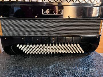 Fisarmonica Pigini mod. Super King. Mano destra voci a mano, 86 bottoni, 46 note Mi/Do# in quarta, 2 voci in cassotto, 15 registri.
