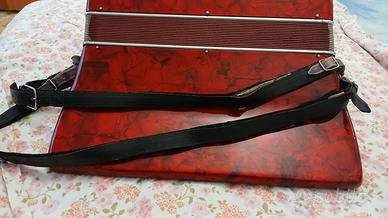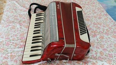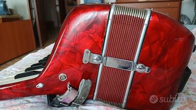 Fisarmonica Elettra rossa in madreperla. 80 bassi e ben 4 registri. Bretelle leggermente usurate dal tempo