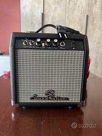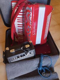 fisarmonica professionale in ottime condizioni con la sua attrezzatura di amplificazione portatile e cavalletto pronta per essere trasportata o suonata.