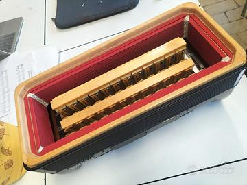 Vendo rara Fisarmonica Paolo Soprani a tastiera 37/96 Professionale IA originale. Acquistata a Natale 1995 e utilizzata poche settimane da studente amatoriale che ha dovuto abbandonare lo studio dello strumento per importanti ragioni personali. La fisarmonica è considerabile assolutamente paragonabile al nuovo, non presenta segni di utilizzo e ogni componente meccanica non ha la minima traccia di usura. Lo strumento è stato provato e aperto da tecnico professionista dell'atelier Verde Fisarmoniche di Leinì (TO) celebre produttore e restauratore di strumenti, nel mese di aprile 2026 (per la prima e unica volta della sua vita) per visionare lo stato di ance, tastiera, bottoniera, mantice, che si presentano impeccabili allo stato "di fabbrica", la fisarmonica presenta una ricca varietà timbrica e un suono pieno ed armonico. La tenuta del mantice è perfetta, tasti e bottoni sono fluidi e silenziosi, nonostante il lungo inutilizzo. Lo strumento è rimasto chiuso nella sua custodia, riposto in un armadio in un appartamento abitato (climatizzato ottimamente) per 30 anni, senza mai venire a contatto con umidità, polvere, sollecitazioni o shock termico. Dettagli tecnici: Marca: Paolo Soprani (Castelfidardo, AN) Modello: Professionale IA Bassi: 96 Tasti: 37 (Tastiera a piano) Registri e voci: 4 voci al canto (con registro musette) 4 voci ai bassi 9 registri canto 2 registri ai bassi Colorazione: Nero lucido con decorazioni argento Condizioni estetiche: Pari al nuovo, nessun graffio o segno Condizioni meccaniche: Ottima risposta dei tasti e dei mantici Misure strumento (in cm): 48 x 44 x 22,5 Peso: 9,8 kg Misure custodia (in cm): 55 x 48,5 x 24,5 Accessori inclusi: Tracolle imbottite e regolabili originali nere "immacolate" Custodia rigida originale inclusa imbottita (interno foderato di grigio, vedere foto) Prezzo poco trattabile viste le condizioni eccelse. Disponibile per ulteriori informazioni e foto. Graditi contatti solo se seriamente interessati, grazie.