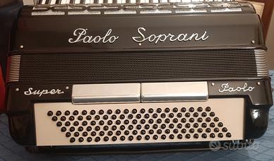 Fisarmonica Paolo Soprani Mod. Super Paolo, strumento professionale, revisionato a settembre 2024 (vedi certificato in foto, garanzia 2 anni), risalente agli anni 90, come nuova, 120 bassi con doppio registro e cassotto, due comandi a barra. 41 tasti, quattro registri più "tirapieno" alla base della tastiera, sette pulsanti per inserimento registri. Tastiera in materiale plastico tradizionale, perfetta.