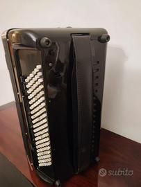 Fisarmonica a bassi sciolti Pigini "Super Bajan Sirius". Caratteristiche mano destra: 5 file, 106 bottoni, 64 note, 15 registri, 7 mentoniere. Caratteristiche mano sinistra: 16'+16', 120 bassi convertibili in 58 note libere (bassi sciolti), raddoppio, sordina. Voci turbo. Misure: 46,5x23x48 cm. Peso: 13 kg.