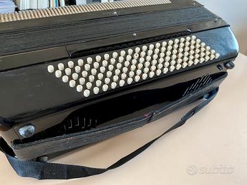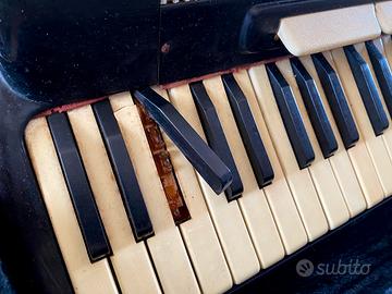 Fisarmonica d’epoca funzionante ma con un tasto nero da sistemare. 120 bassi, gon tracolla e custodia. Ritiro a mano a Roma